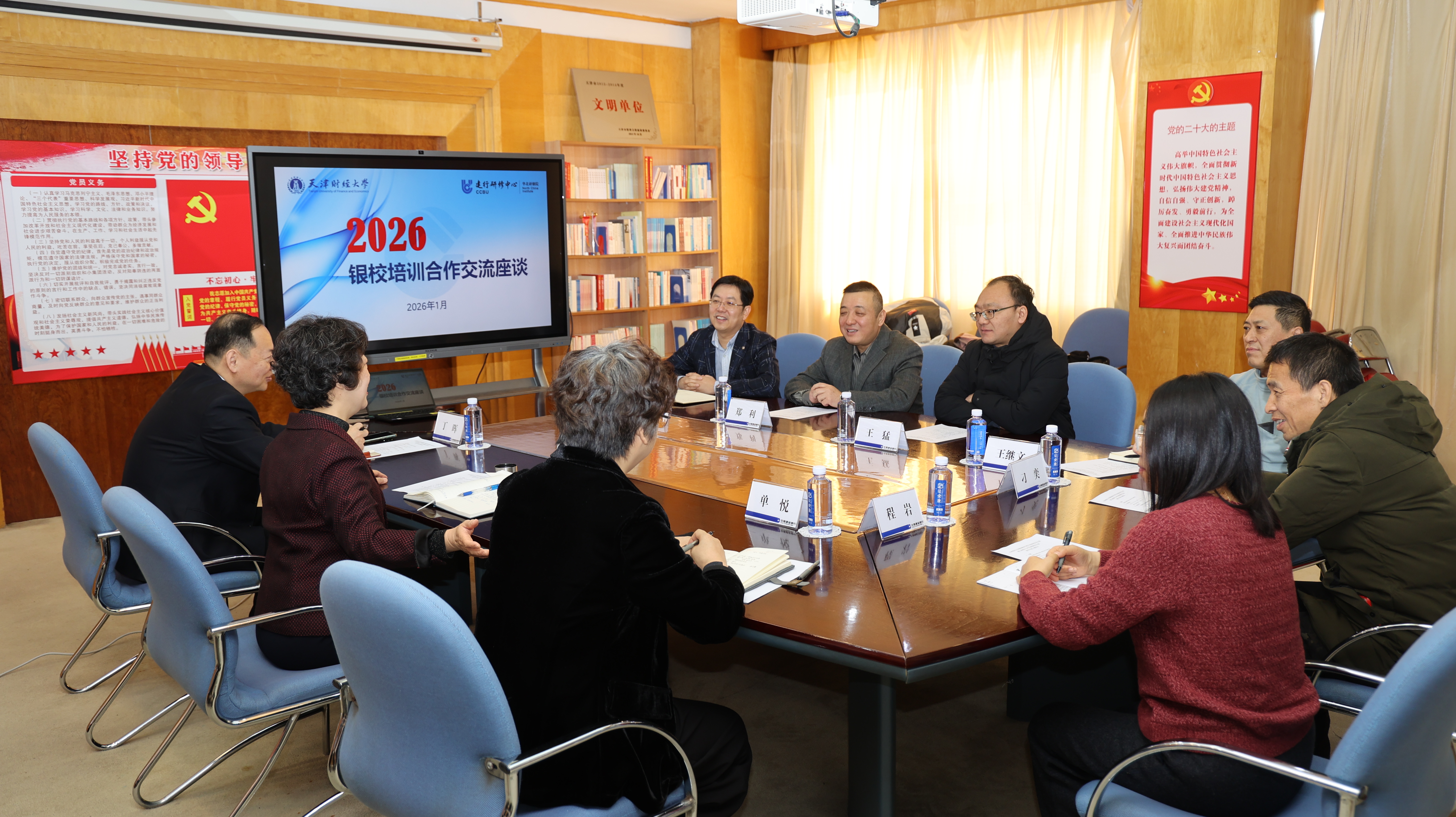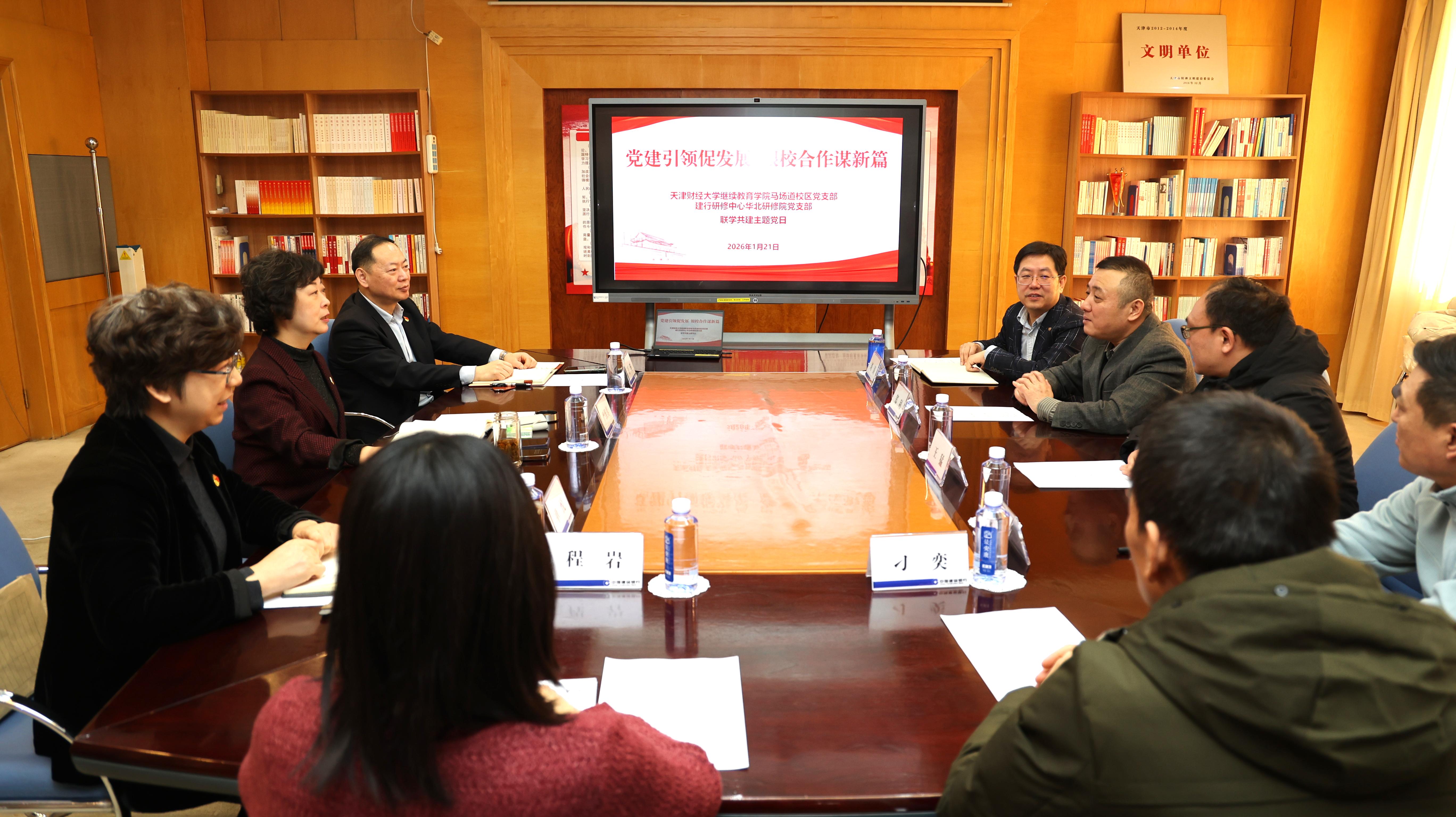 为深化银校合作,探索党建与业务融合新路径,1月21日上午,继续教育学院院长郑利、副院长王猛率珠江道党支部全体党员,赴中国建设银行研修中心华北研修院开展联学共建活动。建行华北研修院对此次交流高度重视,常务副院长严维真及丁晖总经理、单悦高级财务师热情接待,双方围绕非学历教育创新发展、党建经验互鉴及未来深度合作等议题举行了富有成效的座谈。
